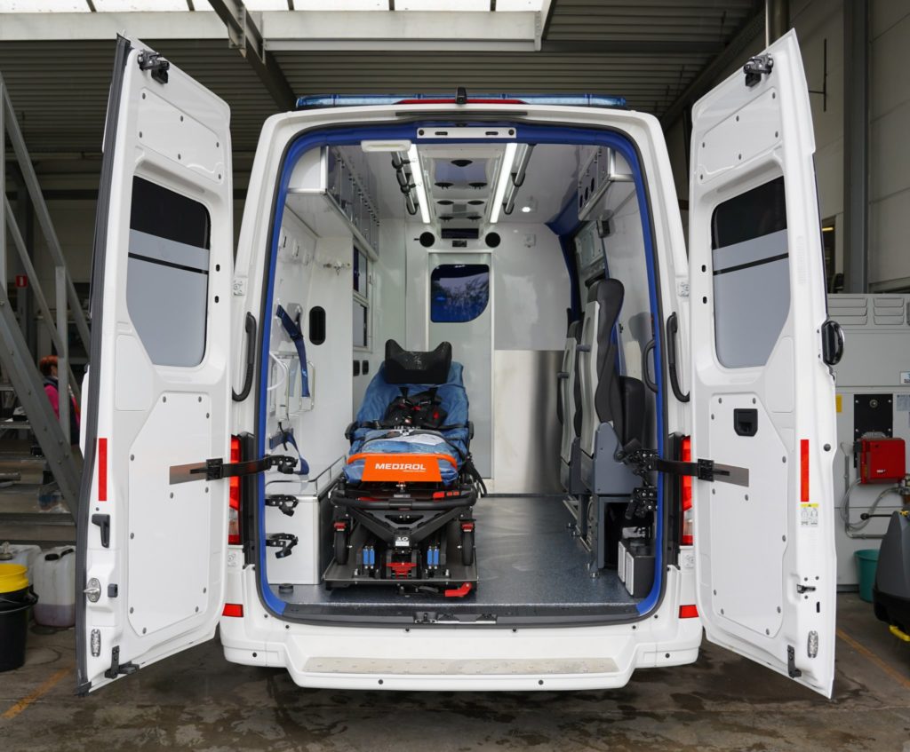 - Civières électriques supportant jusqu’à 320 kg, facilitant les transferts tout en réduisant les efforts physiques pour les ambulanciers